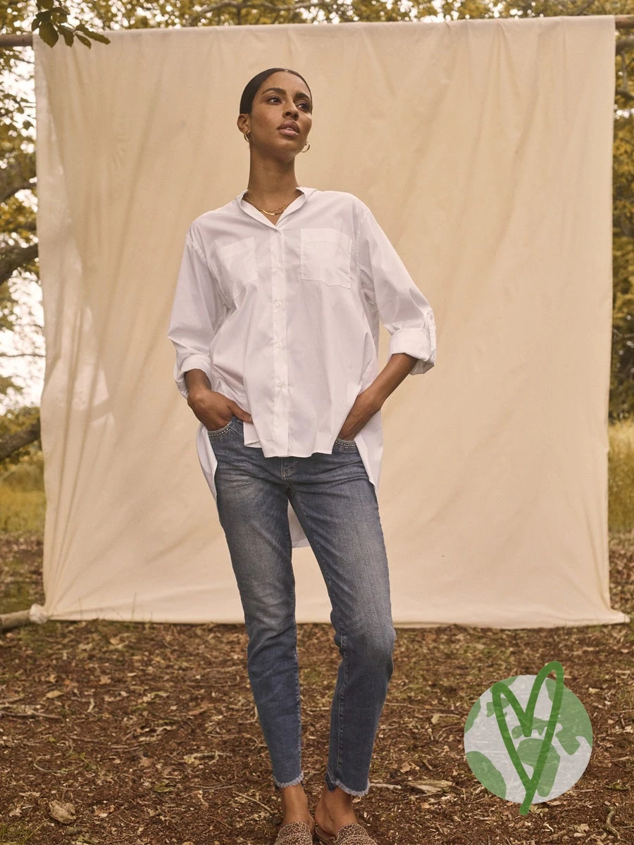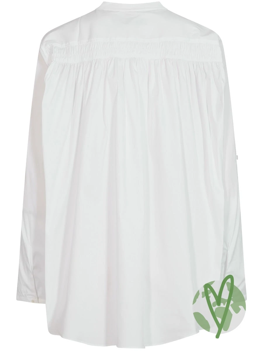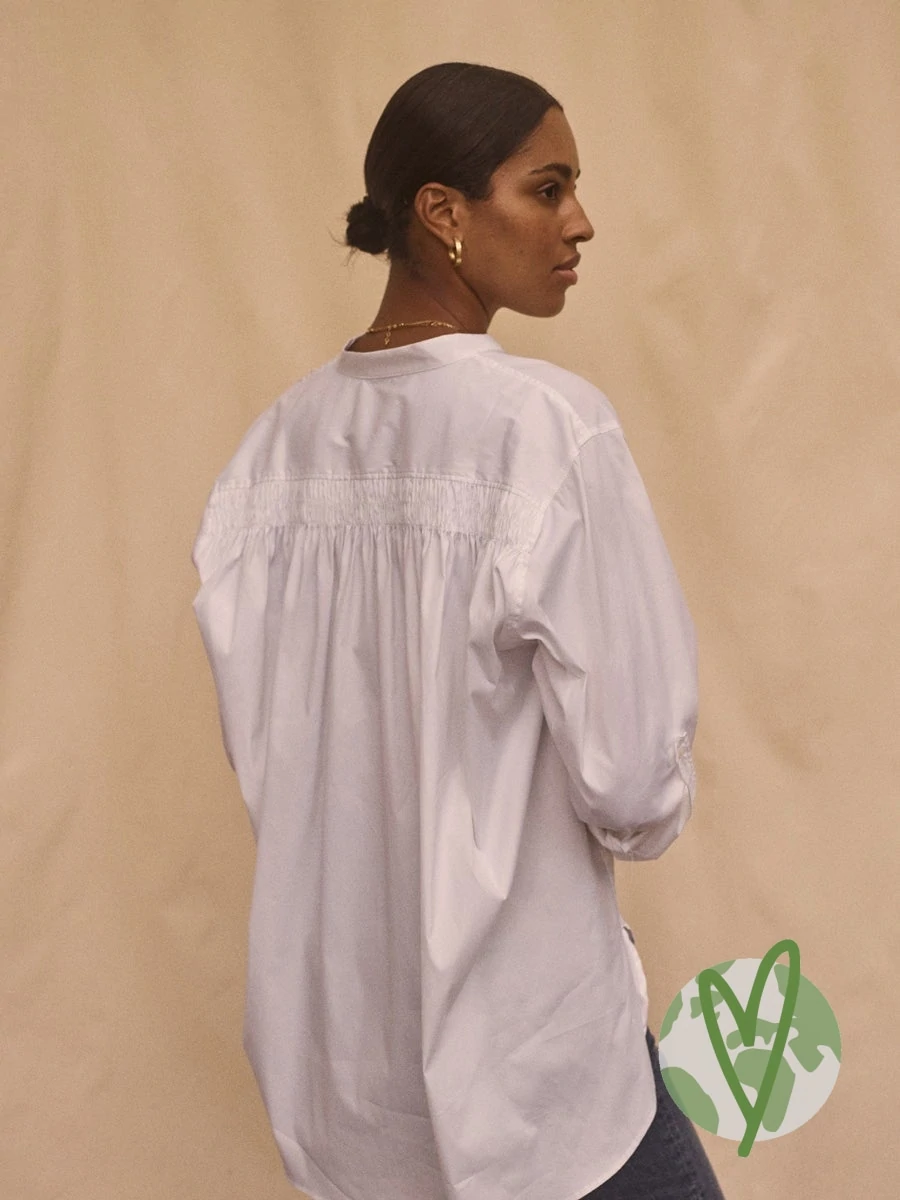 Classic shirt with a modern take in a relaxed fit. This shirt has a cool mandarin collar, classic button closure, front pockets, and wrinkle details with pleats at back. The sleeves hit just above the elbow. Style it with a pair of jeans and sandals.