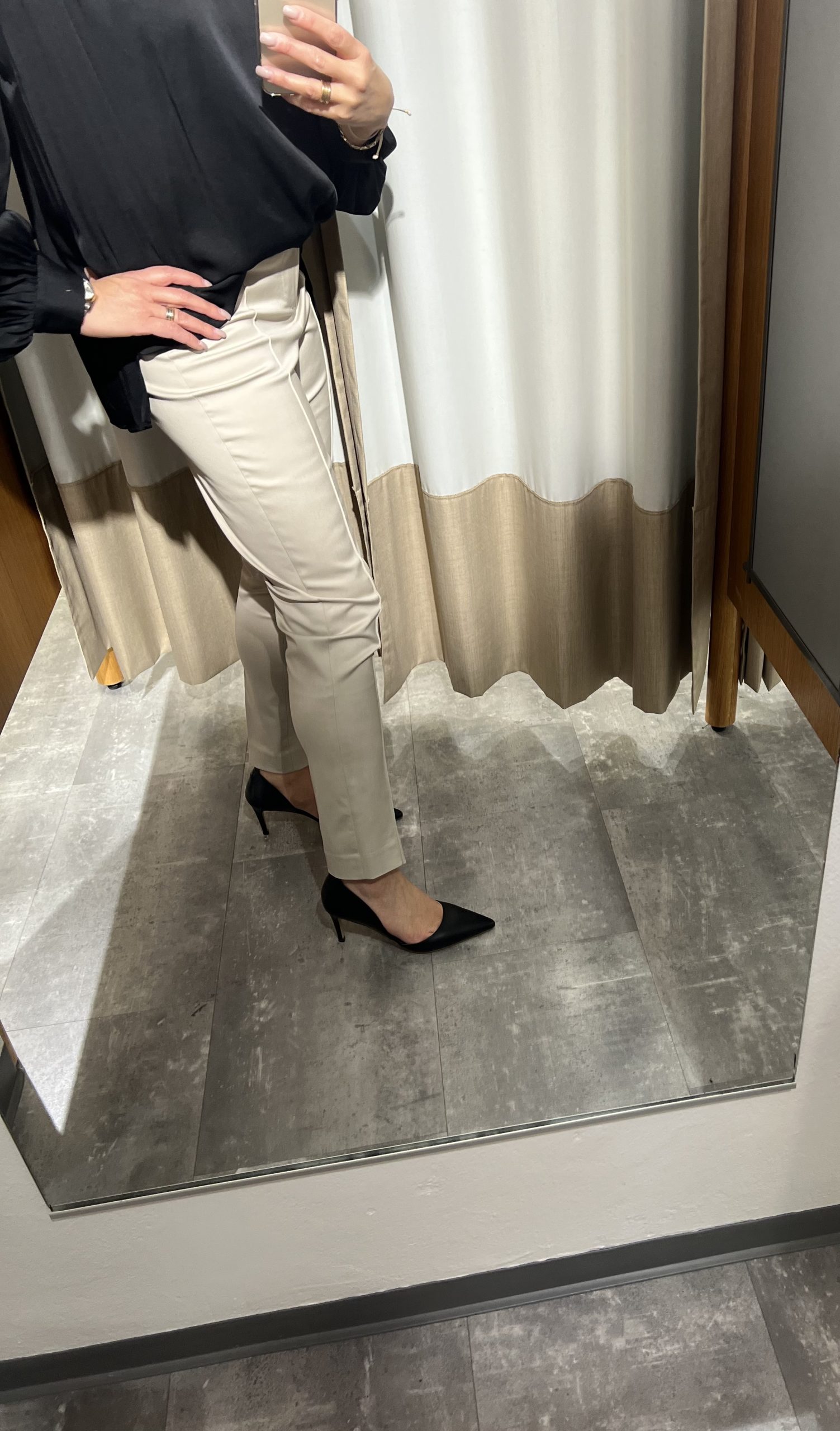 Skinny fit trousers with tapered legs and a piped seam to optimize finish. Added elastic tape inside the waistband for extra comfort and improved fit. The texture and color make it ideal for wearing year-round. – 84% Nylon, 16% Elastane