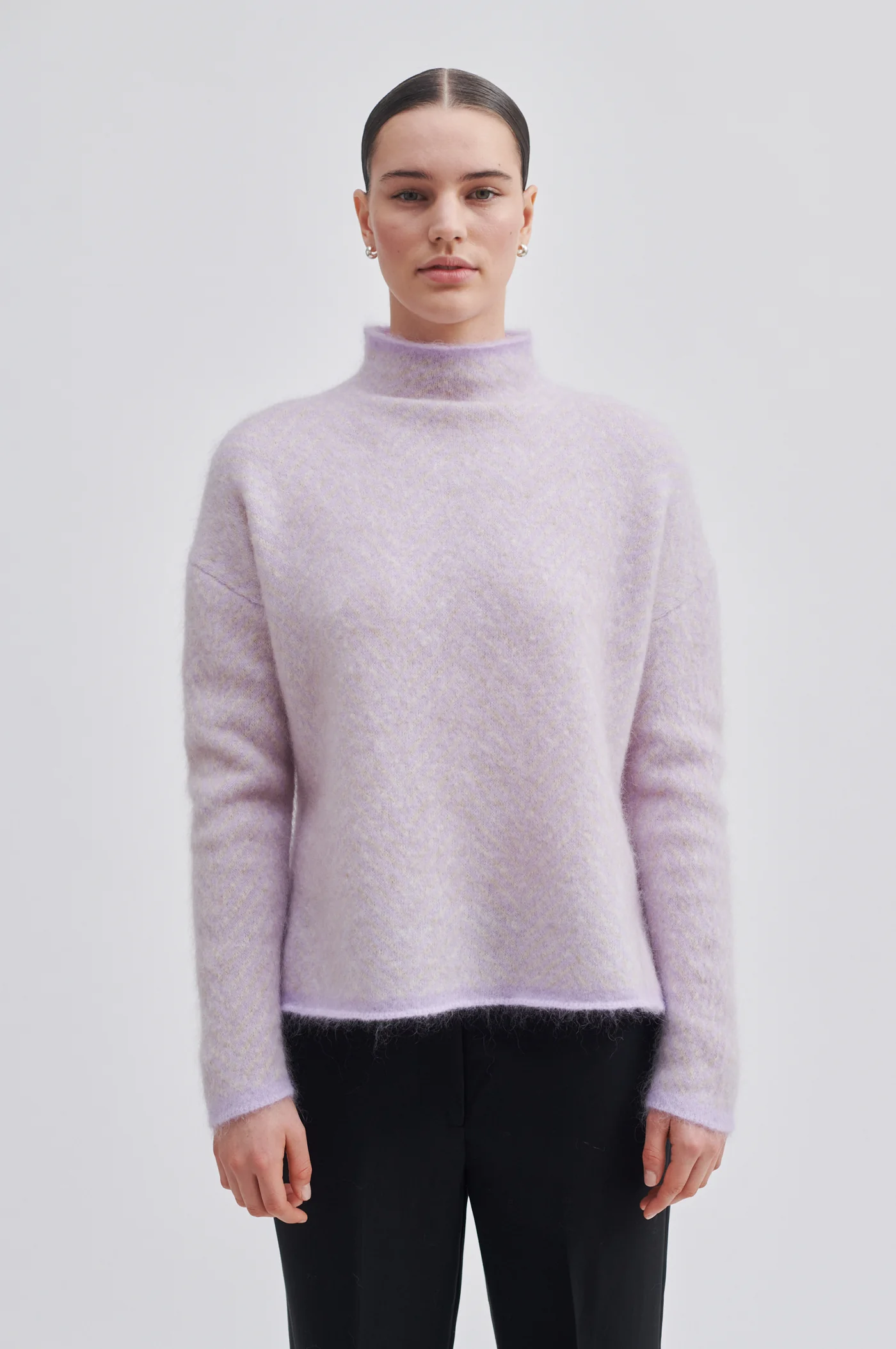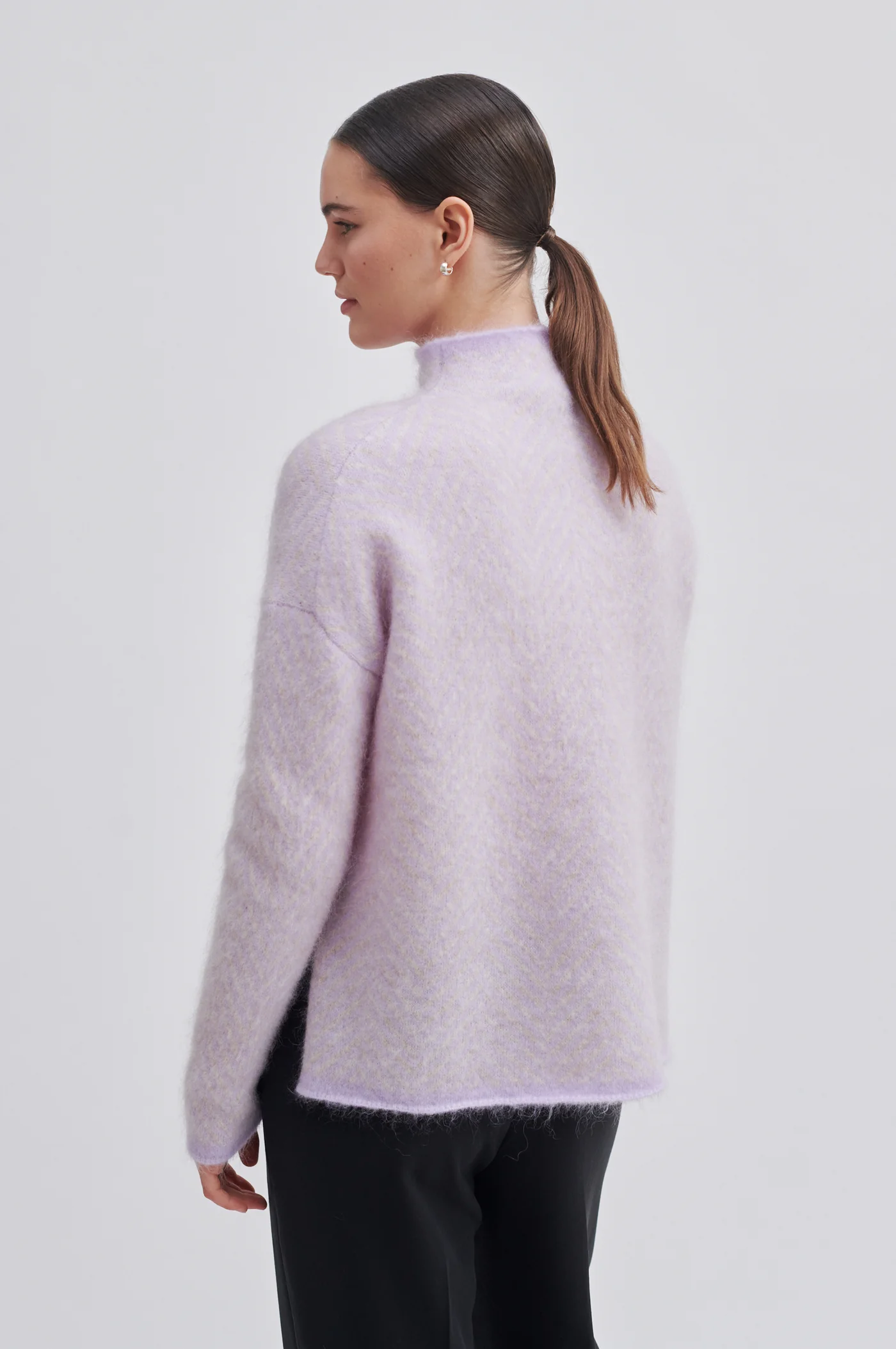 Second Female chevron sweater. Made in soft and stretchy mohair-wool blend yarn with all-over chevron pattern and slightly fluffy texture. Featuring a small turtle neck and long sleeves. Solid trim at neck, cuffs and bottom hem. Dropped shoulders. Wide, slightly boxy fit.