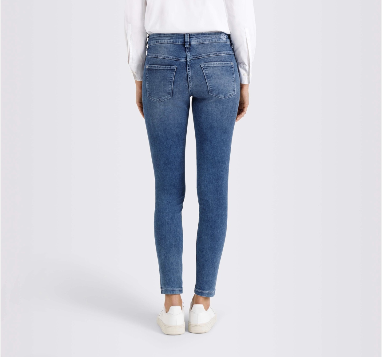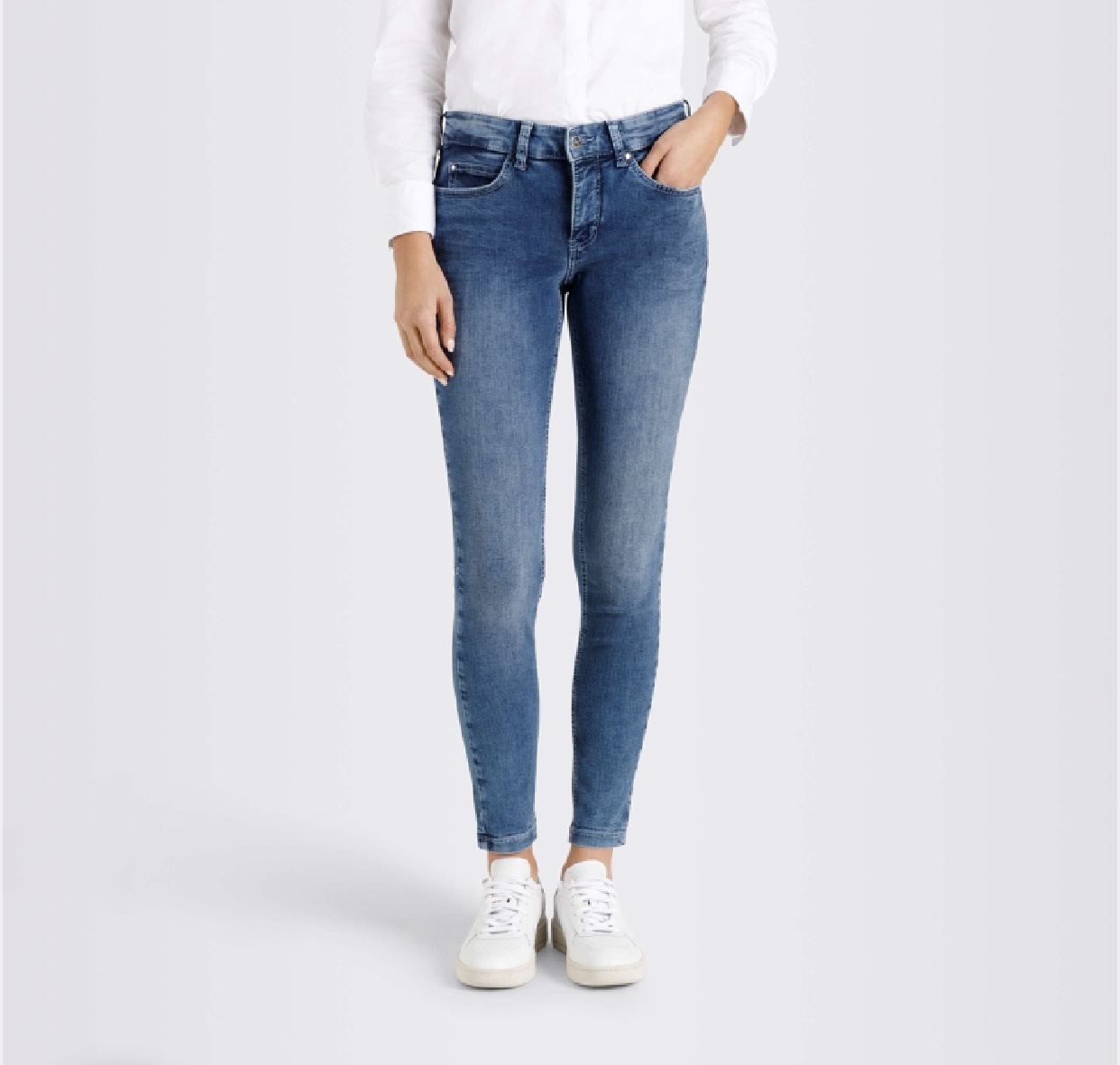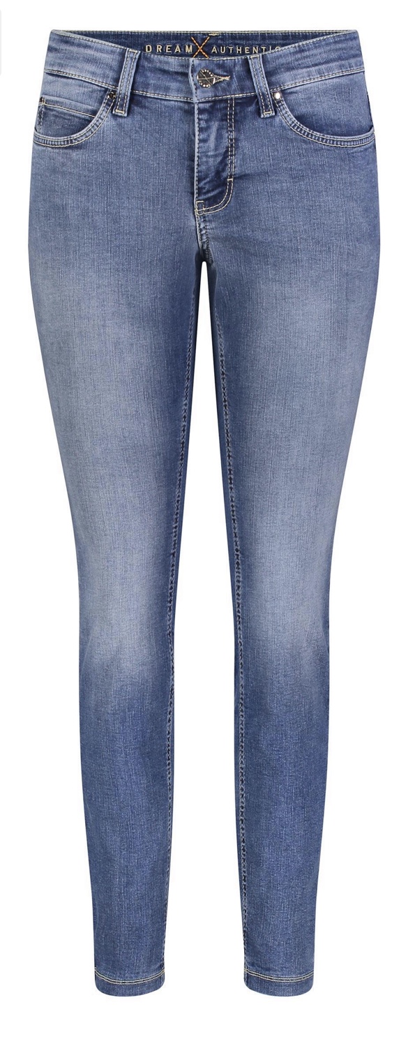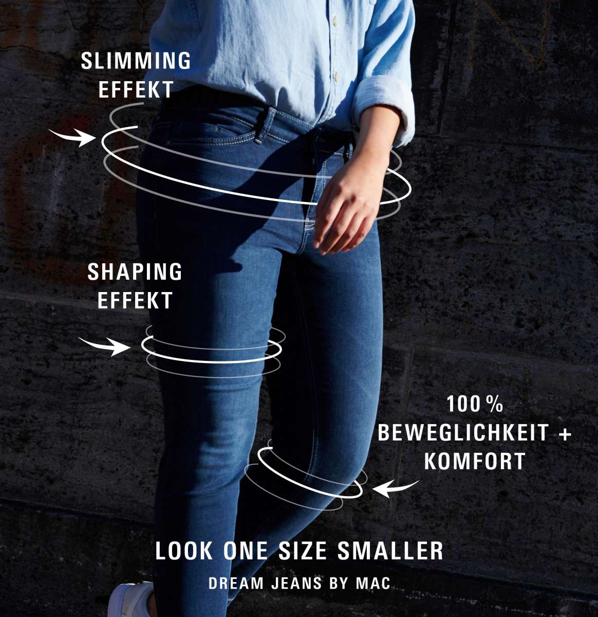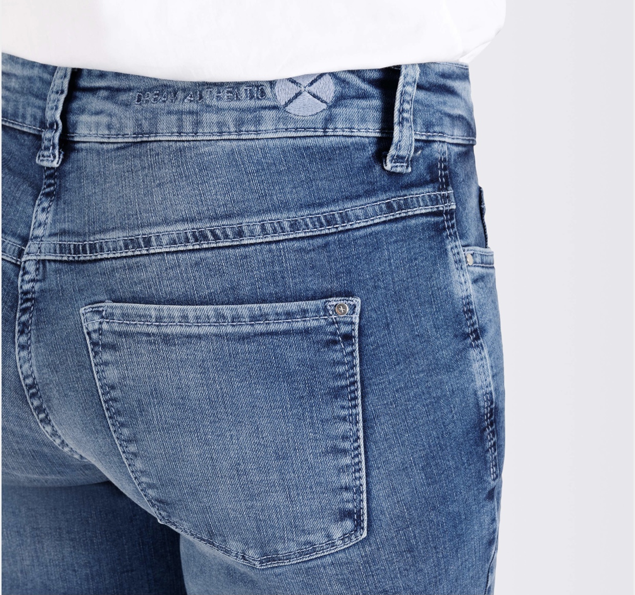 MAC dream denim is an innovative denim material. Thanks to its special composition and high elastane content it has excellent elastic return and a particularly soft touch. This ensures unique wearing comfort for all body types, emphasises the female silhouette, and what’s more, the trousers even fit one size smaller!