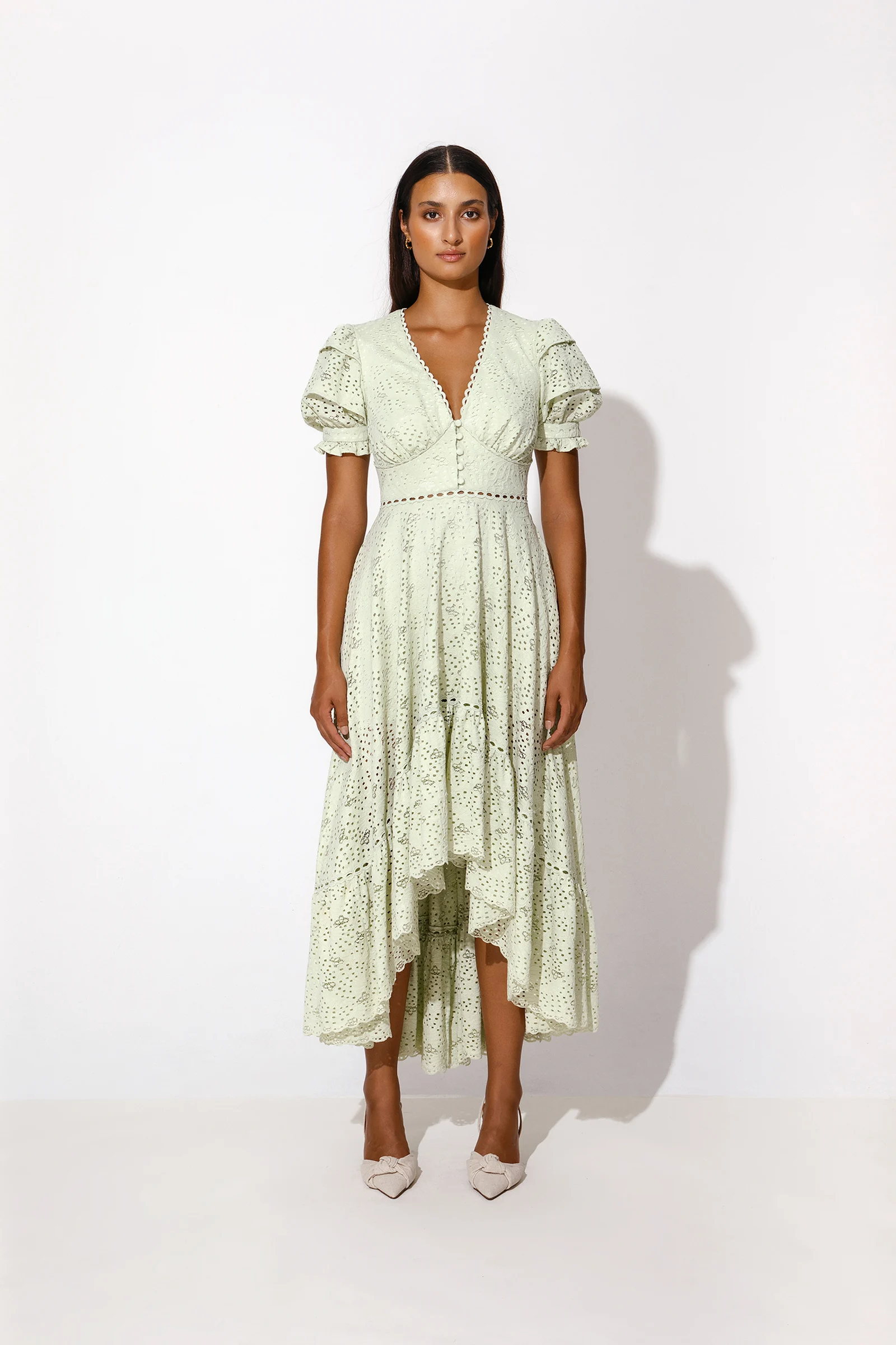 Long sleeve mini dress with flowy skirt and elastic smock in the waist.