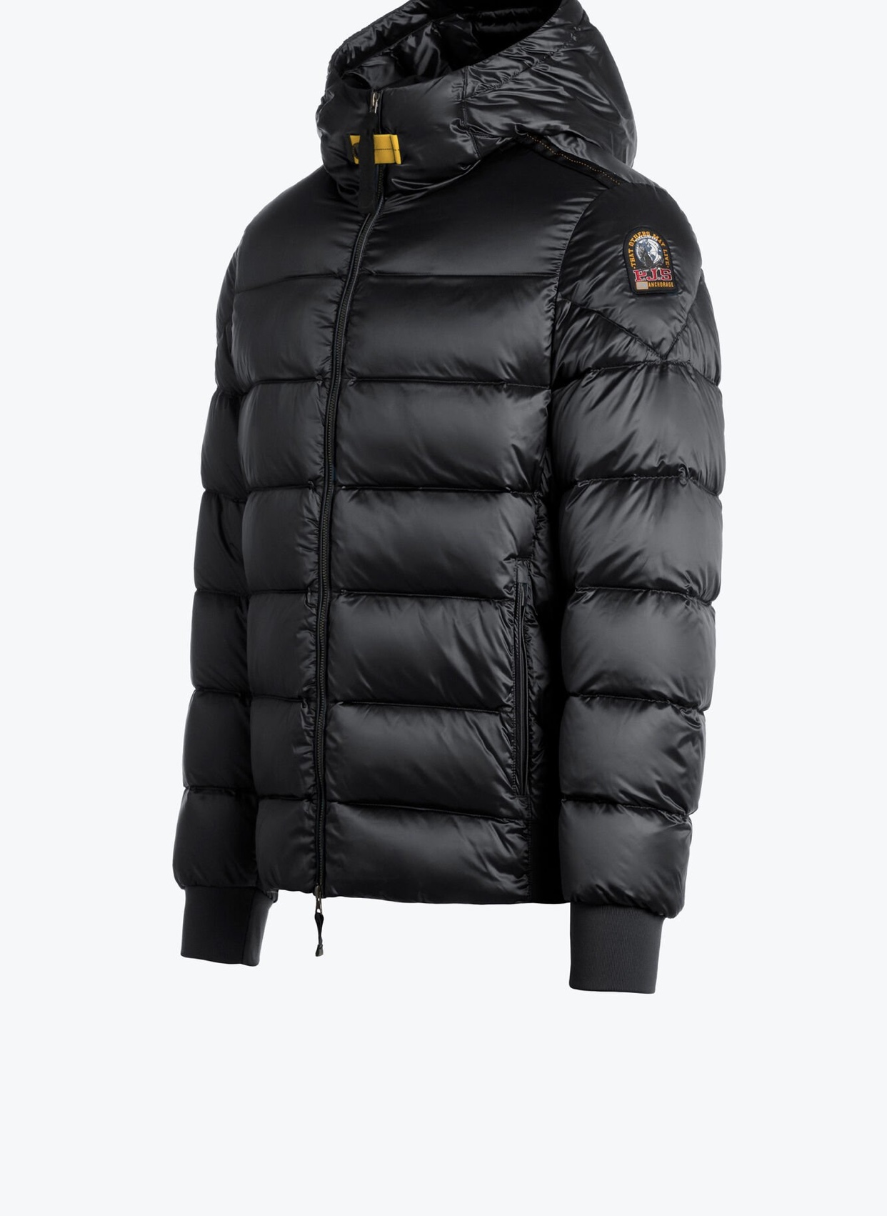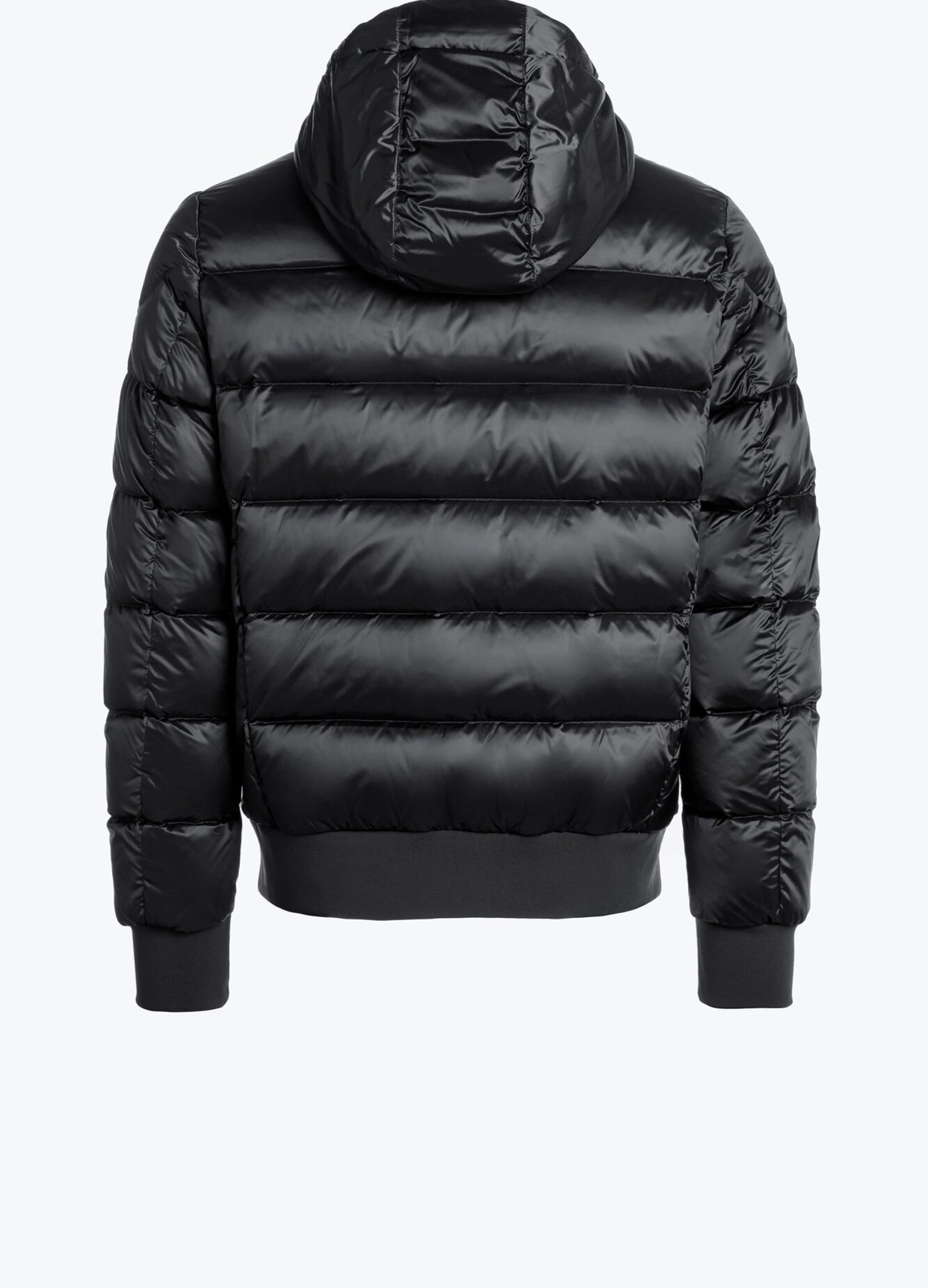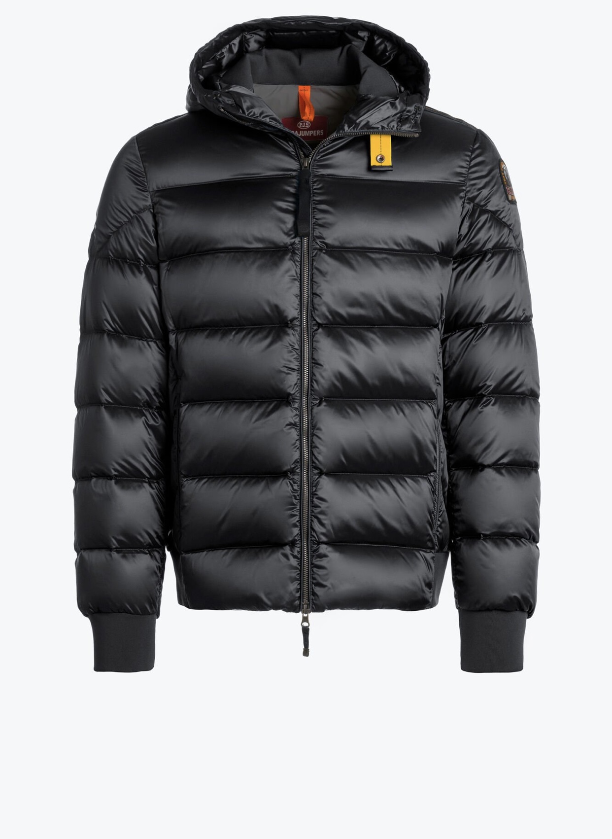 Hooded down-filled 20 den polyester-nylon twill bomber with water repellent treatment. The hood is adjustable by means of a drawstring. Two zippered pockets in front and two pockets on the inside. Two-way zipper and underarm vents. Ribbed cuffs and bottom. Iconic yellow elastic strap neck closure and PJS patch on the left sleeve.