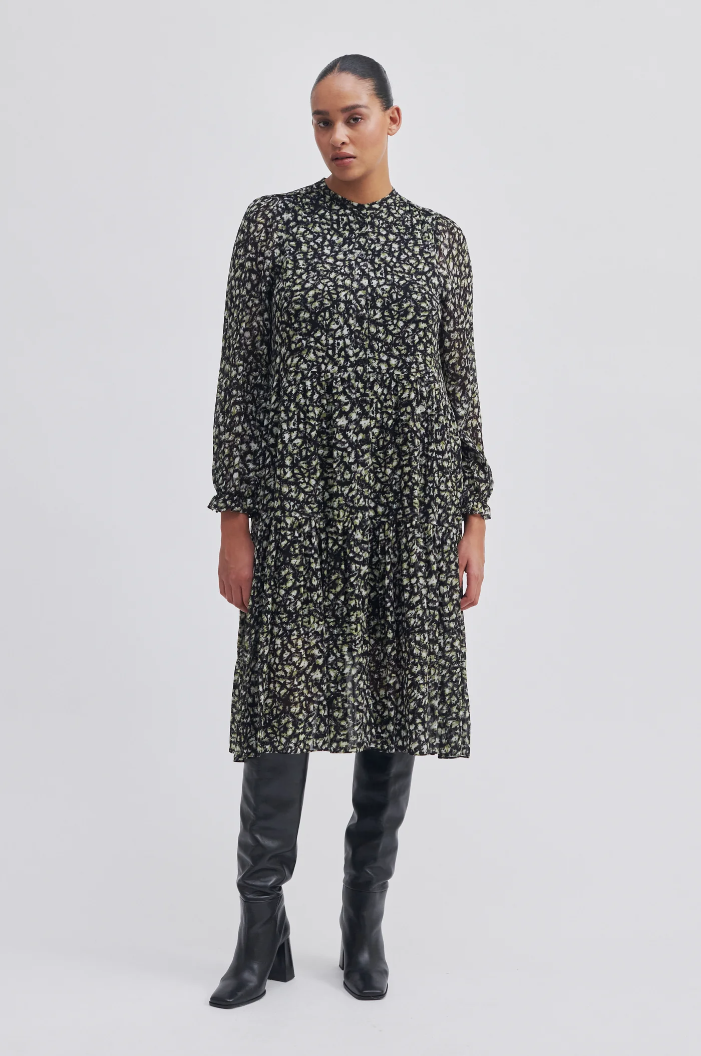 Second Female patterned tier dress. Made in light and semi-sheer viscose with all-over abstract pattern. Featuring a small stand up collar and button-through fastening with covered buttons. Piped details at the shoulders and yoke at the back. Slight gathers at the shoulders to create sheer, puffed sleeves with elasticated cuffs. Lined body and unlined sleeves. Loose fit with tiered skirt that creates voluminous, swingy effect.