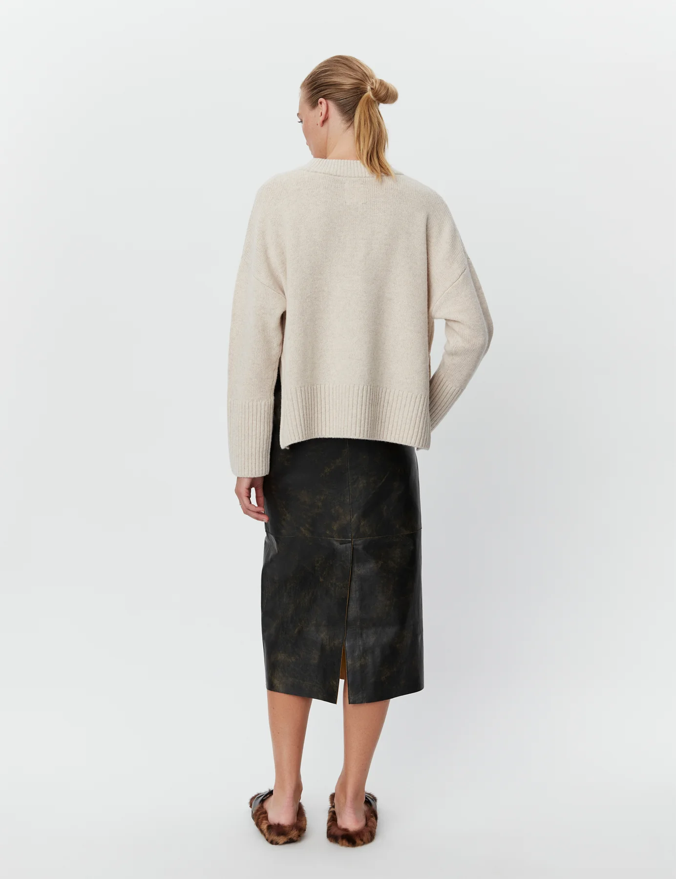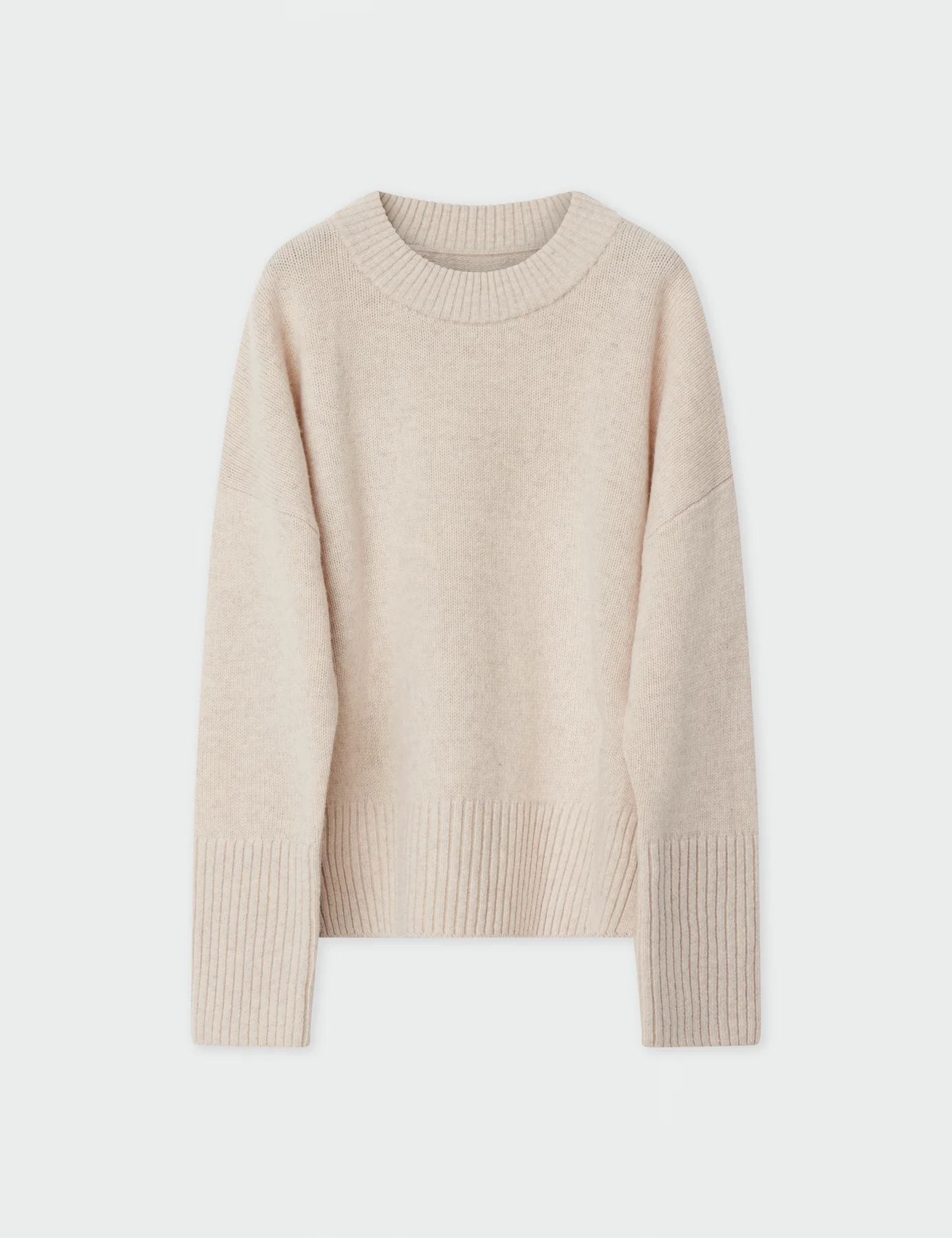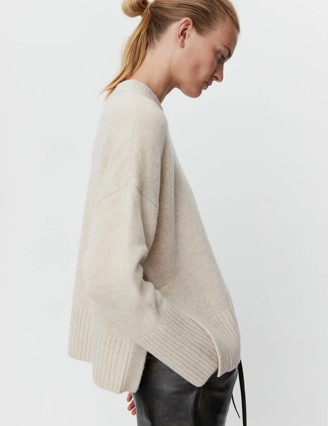 This soft jumper features ribbing at the neck, hem, and sleeves. There are slits at the sides. The jumper has a loose fit.