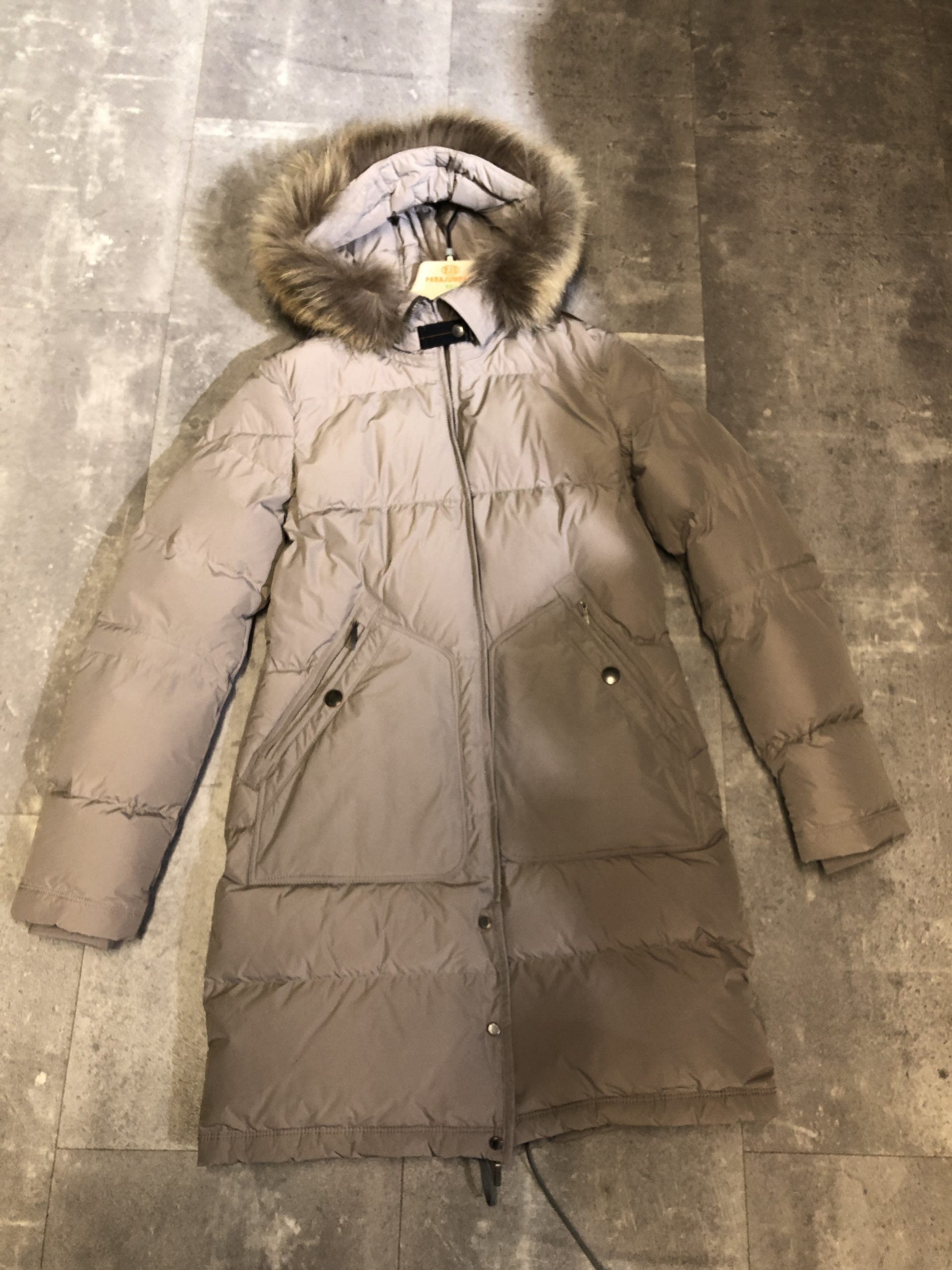 Keep warm with this light long bear coat. Crafted with a central zip closure, a detachable fur trim to the hood, elasticated cuffs and a zippered slit to the back, this piece features four pockets and a press stud fastening to the neck for extra warmth. Finished with the brands signature logo embroidered to the arm and filled in a luxurious down, this would make a welcome addition.